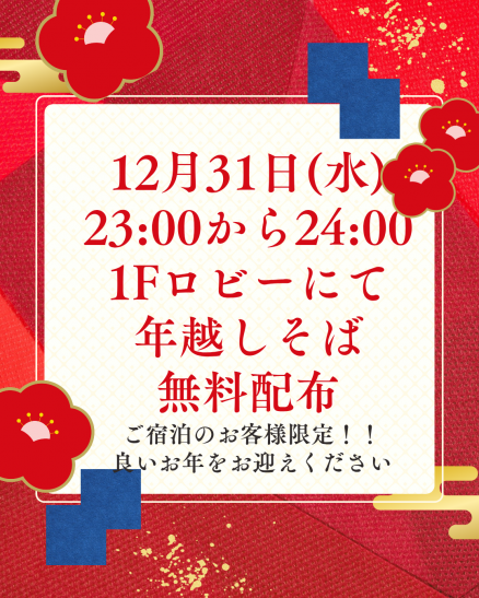 ご宿泊者様限定 年越しそば無料配布 31日23:00~24:001Fロビーにてお待ちしております