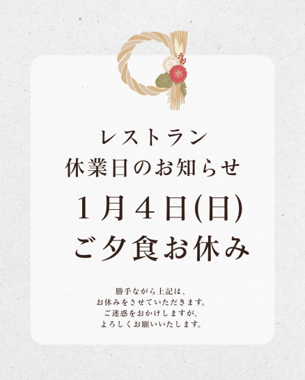 誠に勝手ながら1月4日㈰のご夕食レストランはお休みとさせていただきます。5日から通常営業。朝食はご対応致しております。